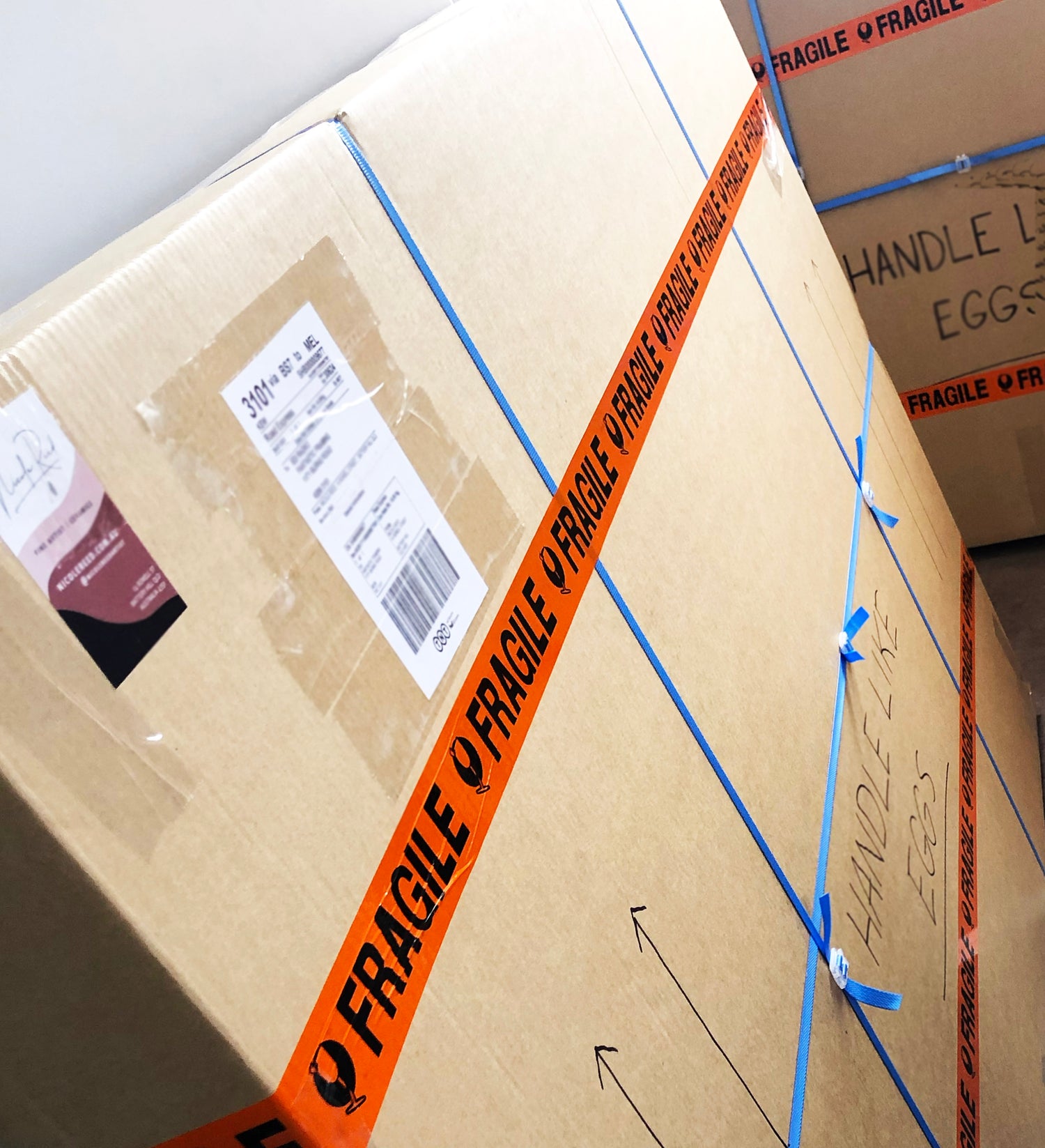 - Paintings on stretched canvas require (by insurance) a protective paper sheet, protective cardboard corners, bubble wrap and a heavy-duty cardboard box made locally. Plastic strapping adds strength and handles for the couriers to carry.